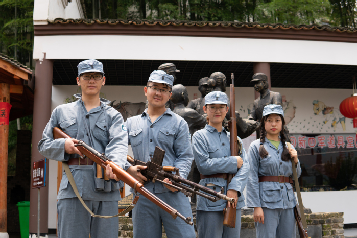 完成安全急救知识宣传后,团队前往新四军军部旧址进行了参观,近距离地接触各种珍贵的图片、文字、书籍、旧物。参观结束后,在当地史料馆工作人员的支持下,实践队员穿上红军装,背上红军时期的武器装备,同学们深深感受到了新四军抗战历史的沉淀,被新四军战士们不怕艰苦,不惧牺牲的勇气和决心所震撼。