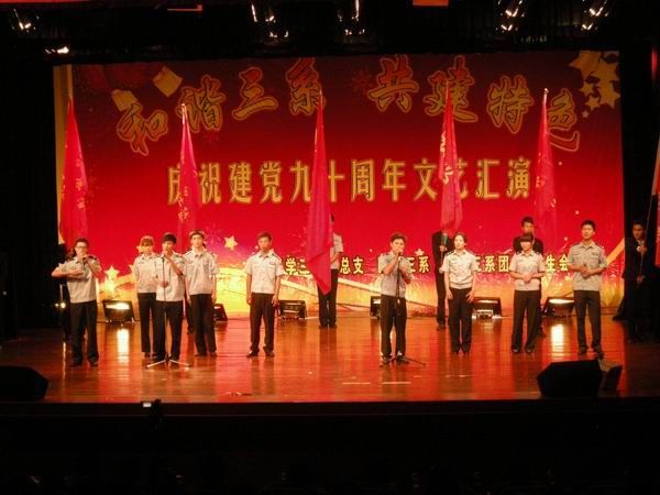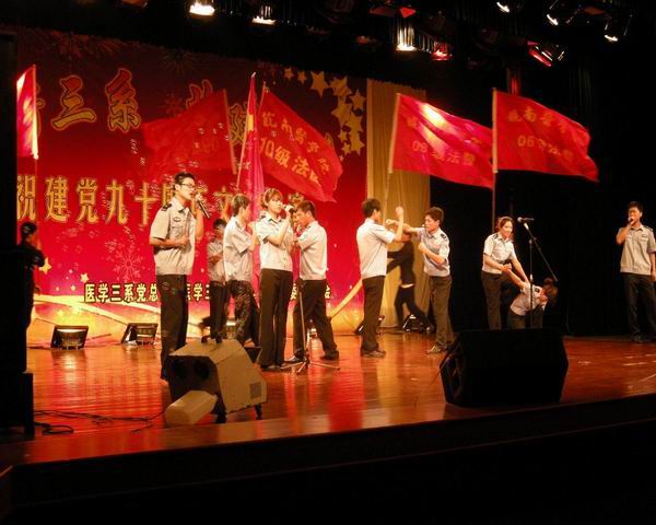 在“和谐三系,共建特色”庆祝建党九十周年大型文艺晚会上,公司法医学专业老员工出色演绎了原创歌曲《永不止步的法医》,引起现场观众强烈反响,将晚会气氛推向高潮。法医专业原创歌曲《永不止步的法医》,在系部领导陈阳主任、唐传莉书记亲自指导下,由张越老师创作填词,法医专业07级原泉、08级周永彬编曲,08级马彬、09级张天叶编舞,法医专业08级、09级、10级老员工参与表演。