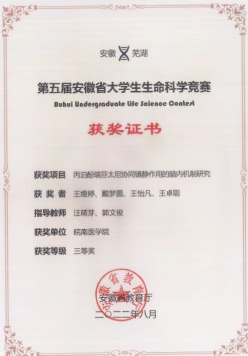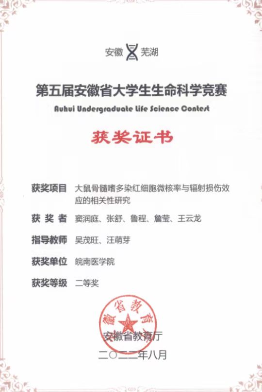 第五届安徽省老员工生命科学竞赛决赛于 2022 年7月30日在安徽师范大学举行。本次竞赛为全国老员工生命科学竞赛(2022,科学探究类)安徽赛区决赛,参加院校26所,参赛项目数392项。公司2018级本科生窦润庭团队和戴梦圆团队分获省级二等奖和三等奖。