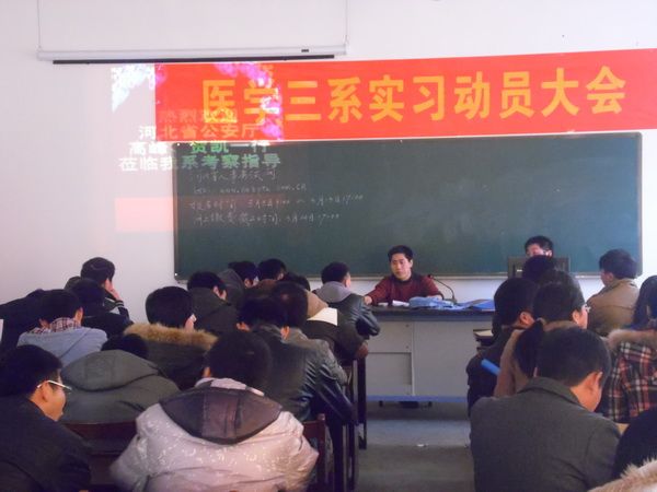 河北省公安厅政治处贺凯、技术处高峰两名警官充分肯定了公司法医专业的办学质量,高度赞扬公司法医专业近几年来尤其是被评定为国家级特色专业后的快速发展,认为作为华东六省最早开设法医系的医公司校,在近二十年的办学中为河北省乃至全国的公安系统培养了大批优秀的法医毕业生。随后,两位省厅同志向08级法医专业毕业生介绍了河北省情、河北公安系统概况和相关招考信息,并对同学关注的考试相关问题给予了详细解答;最后指出今年河北省各级公安系统将招录200余名公安法医,希望2008级法医毕业生都能够踊跃参加河北省2013年公务员法医职位录用考试,成为一名光荣的燕赵刑警。 会上,陈阳主任指出,河北省今年大量招录公安法医并特派两位警官来到我系开展招考宣传,这是对公司法医学专业的办学质量和法医毕业生业务能力的高度认可,对于毕业生来说,是一个前所未有的就业机遇,希望2008级法医毕业生抓住机遇、认真准备、积极报考。 唐传莉书记代表党总支和全体师生,感谢河北省公安厅特派专员来到公司开展2013年公务员考试法医职位招录的信息宣传。动员2008级法医毕业生时刻谨记公司“精医尚德、求实自强”的校训,充分发扬我系“刻苦努力、拼搏进取”的法医精神,争取在公务员考试甚至今后的公安工作中取得更优异的成绩。 随着国考和各省地方公务员考试陆续拉开帷幕,医学三系法医学毕业生也在认真备考。截止到目前, 2008级法医专业已经有2名同学进入国家公务员考试面试阶段、14名同学进入上海市公安局和*****面试阶段、9名同学入围连云港市公安局法医特招考试、7名同学参加南通市公安局法医特招考试、1名同学进入遂宁市公安局政审阶段。