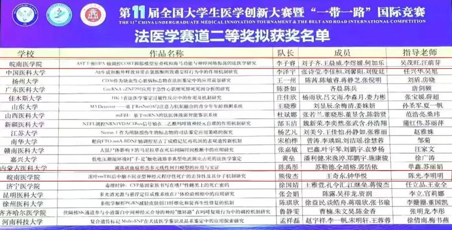 比赛过程中,参赛同学沉着冷静,表现优秀,充分展示了各自团队的研究思路、实验设计和实验成果,具有鲜明的法医学特色和理论创新价值。经过激烈角逐,上述团队从129支参赛团队中脱颖而出,获得创新研究和创新设计赛道二等奖。